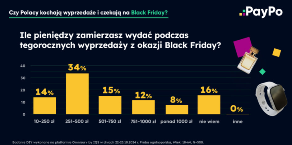 Black Friday, czy obecnie nawet Black Week, jest okresem, w którym konsumenci wydają znacznie więcej na planowane (a częściej nawet na te nieplanowane) zakupy. Według badania firmy PayPo przeprowadzonego w październiku 2024 r. najwięcej osób przeznaczy kwotę 251-500 zł na wyprzedażowe zakupy w Black Friday.