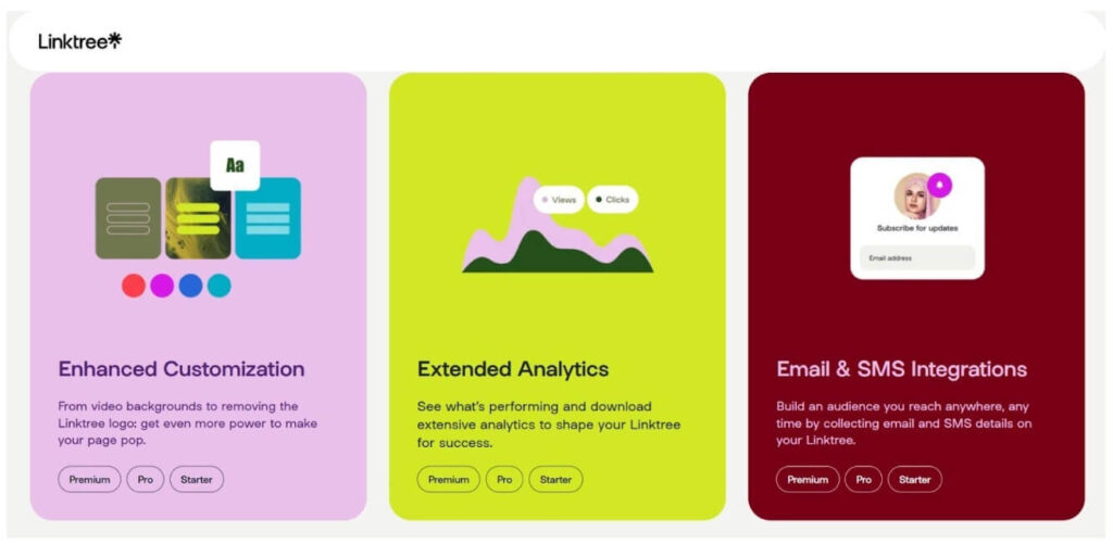 Linktree oferuje darmowy plan z nieograniczoną liczbą linków, dostępem do motywów, niestandardowych kolorów tła, analiz z ostatnich 28 dni oraz ikon społecznościowych. Dostępne są także trzy płatne plany, które odblokowują zaawansowane funkcje.