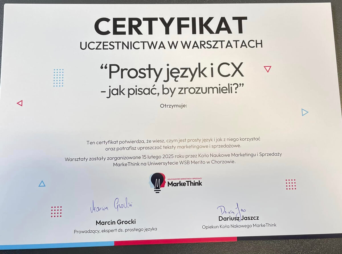 Czy kiedykolwiek zdarzyło Ci się czytać tekst marketingowy i czuć, że to czysta magia… tylko w niezrozumiałym języku? Zbyt skomplikowane sformułowania, branżowy żargon i zdania długie jak niekończący się poniedziałek. A przecież w komunikacji chodzi o jedno – by przekaz był jasny i zrozumiały! Właśnie dlatego jako Koło Naukowe Marketingu i Sprzedaży MarkeThink zorganizowaliśmy warsztaty „Prosty język i CX. Jak pisać, by zrozumieli?”.